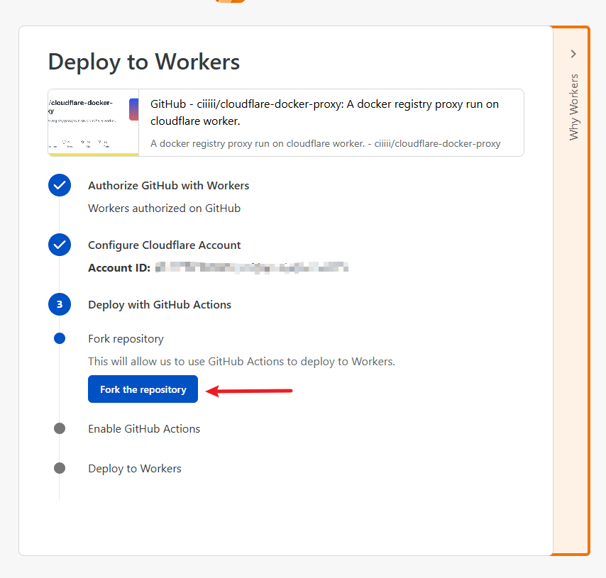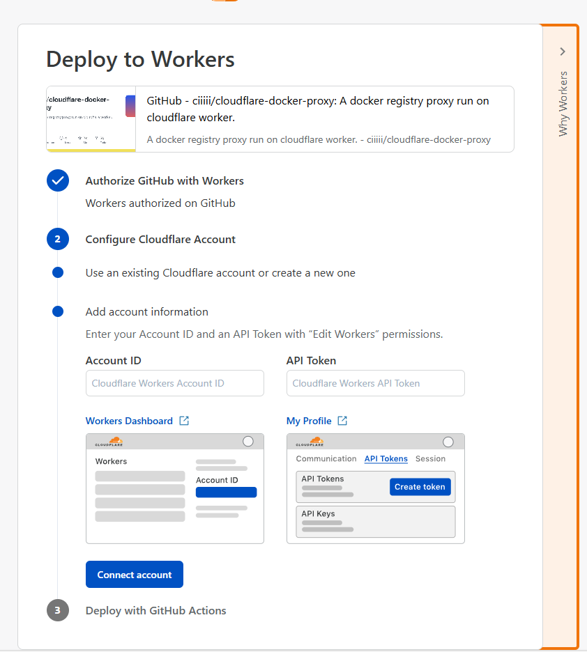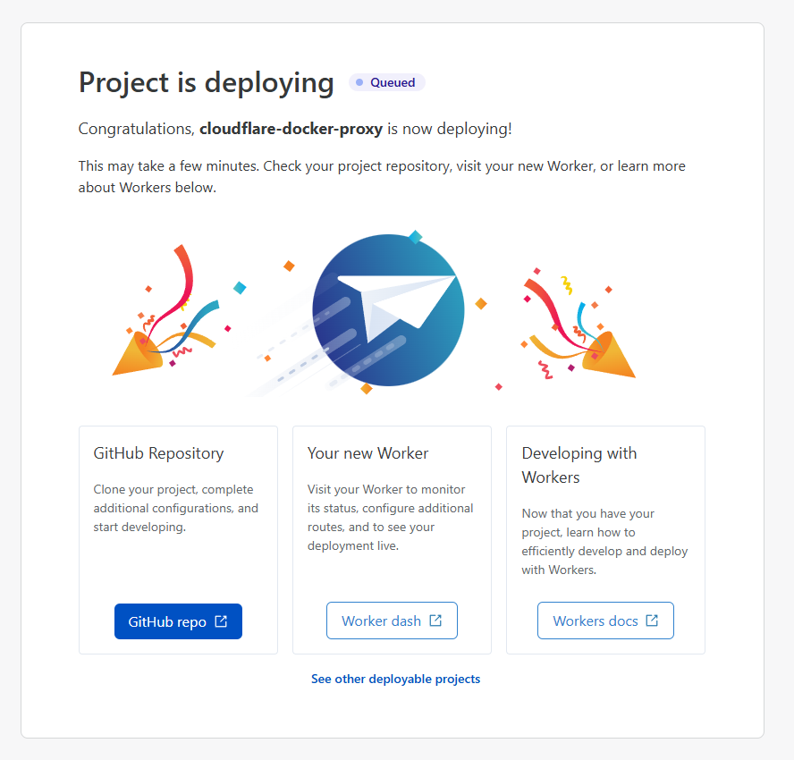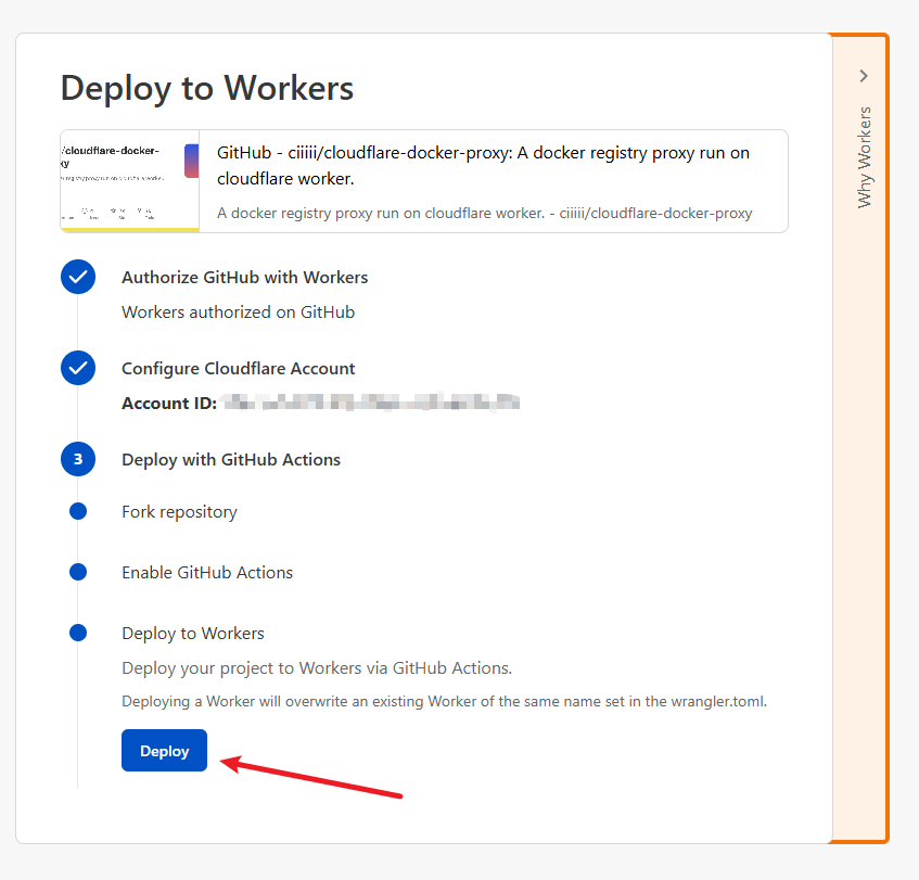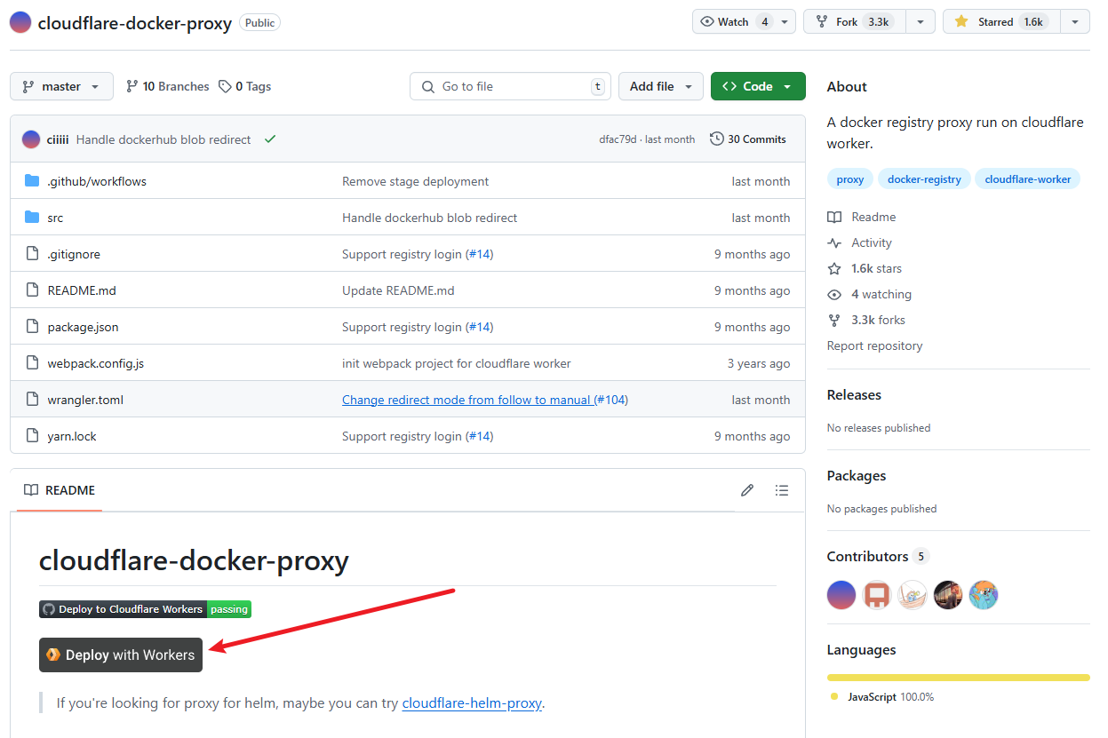 首先在浏览器中登陆你的 Github 账号,然后打开 ciiiii/cloudflare-docker-proxy 项目,点击 Deploy with Workers 按钮: