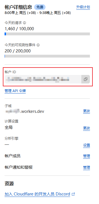 如果你已经登陆过 Cloudfalre 账号会直接跳转到你的账号的 Workers 页面,账号 ID 就在右边。点击右边的复制按钮复制你的账号 ID ,粘贴到左边的输入框中: