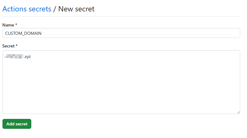在 Name 中输入 CUSTOM_DOMAIN ,在 Secret 中输入你的域名,这个域名应和你在刚才在 区域资源 中选择的域名一致。最后点击 Add secret :
