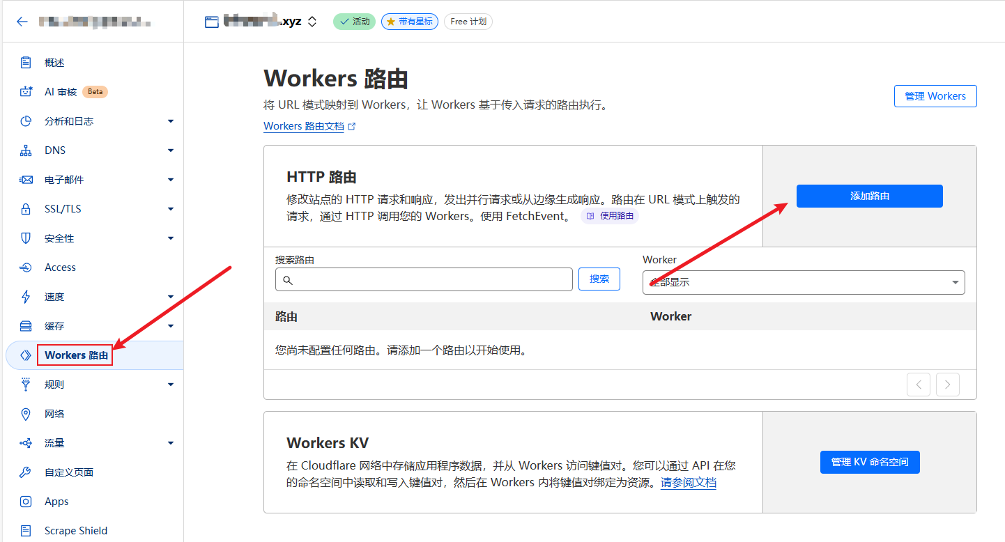进入到你的域名的管理页面,点击 Workers 路由 => 添加路由 :
