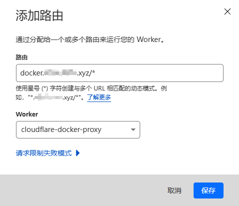 下面的 Worker 选择刚才创建好的 Worker ,上面的 路由 输入 docker.你的域名/* (例如 docker.example.com/*),最后点击 保存 :