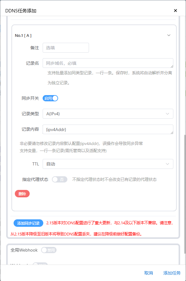 下滑页面,点击 添加同步记录 ,记录名 输入刚才路由的域名, 记录类型 选择 A(IPv4) ,最后点击 添加任务 :